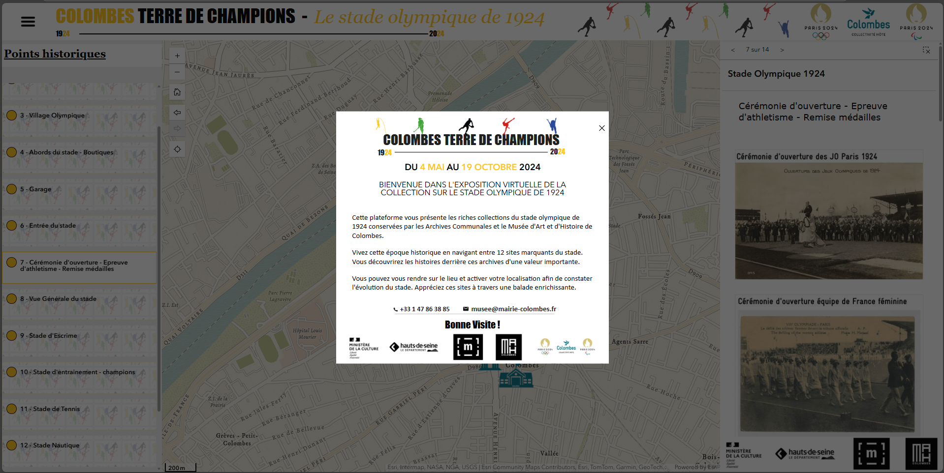 Cette application est la toute première réalisation que j’ai développée à la Ville de Colombes. Durant les Jeux Olympiques de Paris, la Ville de Colombes a eu la chance d'accueillir certaines épreuves, à l'instar des J.O. de 1924. Pour célébrer les 100 ans, les Archives Communales et le Musée d'Art et d'Histoire se sont associés pour organiser une exposition retraçant l'histoire olympique de Colombes. En collaboration avec ces services, j’ai donc conçu cette application qui consiste en une version en ligne de l'exposition.