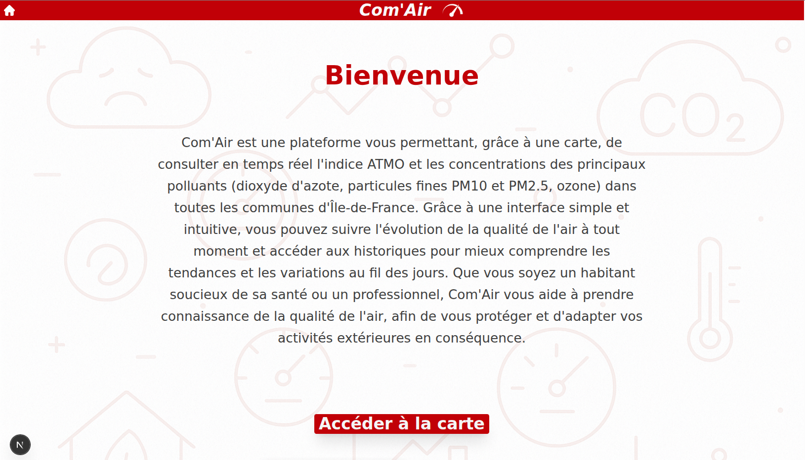 Avec une page d'accueil de présentation, l'application est centrée autour d'une carte principale unique. Cette cartographie représente directement chaque commune avec une couleur dont l'accentuation est proportionnelle à l'importance de la valeur de son indice de pollution ATMO. Une section permet de choisir le type de polluant spécifique dont les valeurs doivent être représentées. À la sélection d'une commune, les valeurs des concentrations des polluants sur son territoire s'affichent en dessous de la section de choix de représentation. Il est également possible d'accéder à l'historique des concentrations de polluants pour chaque commune sélectionnée.