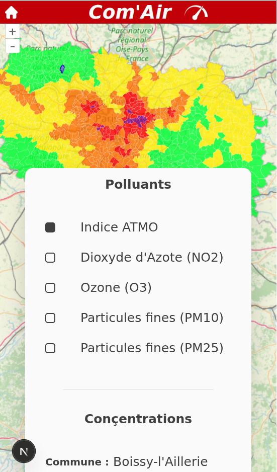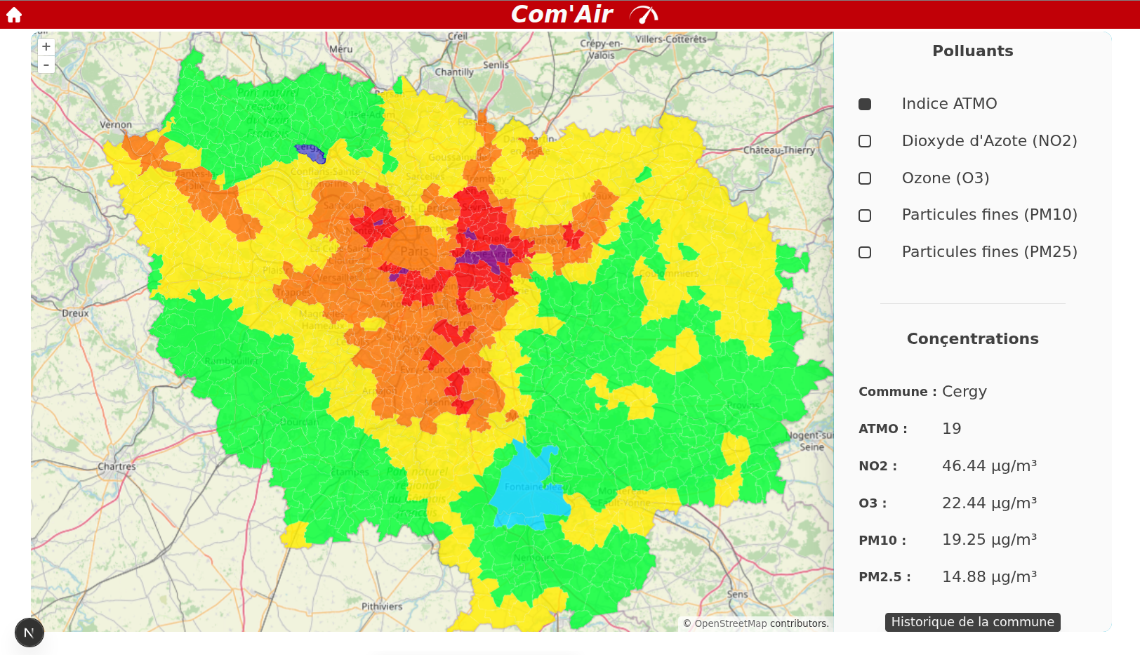 Cette application est le fruit d'une volonté personnelle de faciliter l'accès à l'information sur la qualité de l'air en Île-de-France. Mon travail avec les données de l'agence AirParIf m'a permis de constater la difficulté d'accéder à ce type d'information en fonction des collectivités territoriales. Ainsi, j'ai travaillé sur la mise en place de cette application, permettant de consulter facilement les concentrations des principaux polluants dans l'air sur la base du découpage administratif communal.