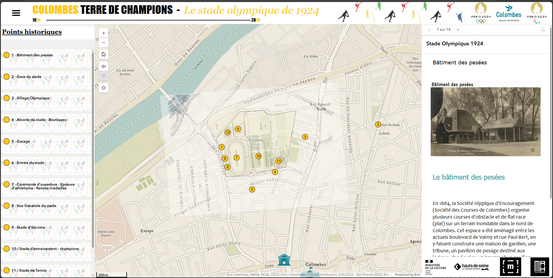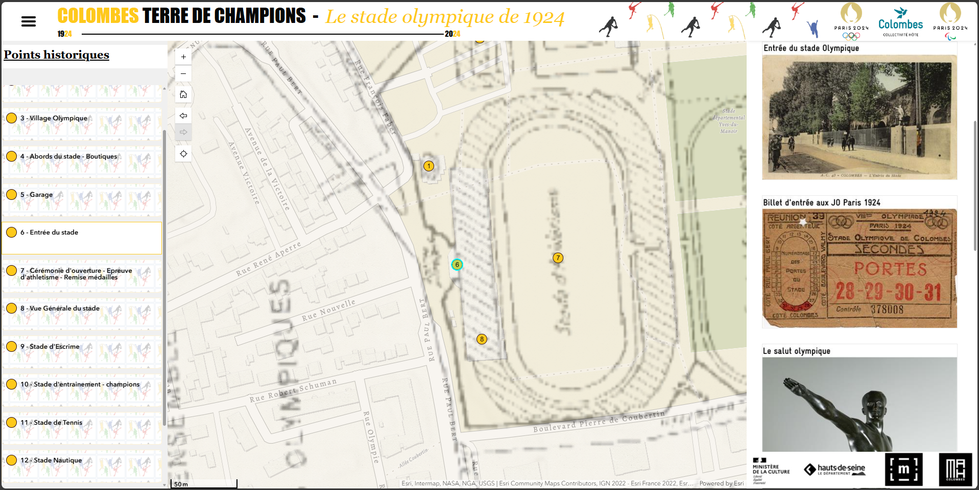 Cette application est la toute première réalisation que j’ai développée à la Ville de Colombes. Durant les Jeux Olympiques de Paris, la Ville de Colombes a eu la chance d'accueillir certaines épreuves, à l'instar des J.O. de 1924. Pour célébrer les 100 ans, les Archives Communales et le Musée d'Art et d'Histoire se sont associés pour organiser une exposition retraçant l'histoire olympique de Colombes. En collaboration avec ces services, j’ai donc conçu cette application qui consiste en une version en ligne de l'exposition.
