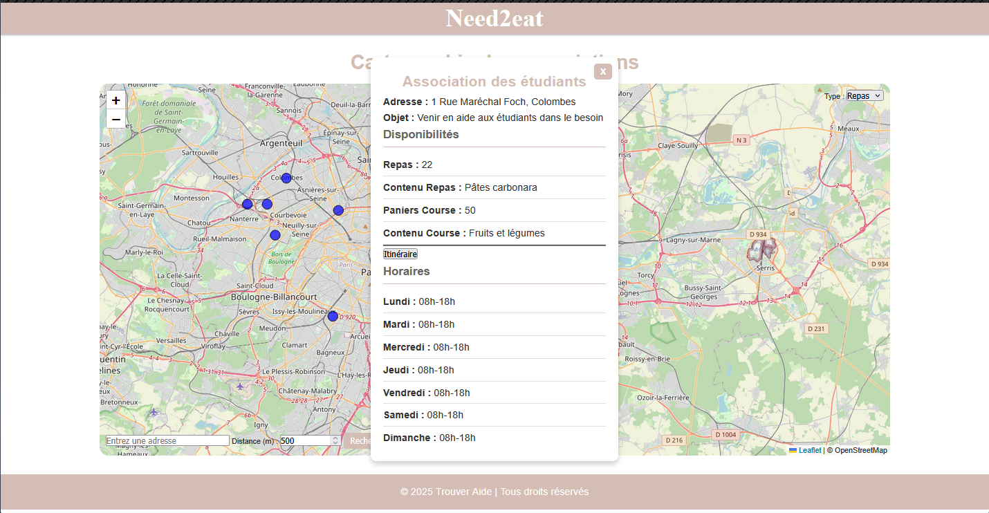 Pour accéder à la plateforme, il faut créer un compte en ayant le choix entre un profil Association ou Étudiant. Avec un profil Association, on peut mettre à disposition son adresse, ses horaires, les aides disponibles et consulter les commerces et résidences étudiantes. Avec un profil Étudiant, on peut visualiser les associations avec des disponibilités en fonction de ses besoins et de sa proximité. L'application intègre aussi un système d'itinéraire pour s'orienter vers les associations.