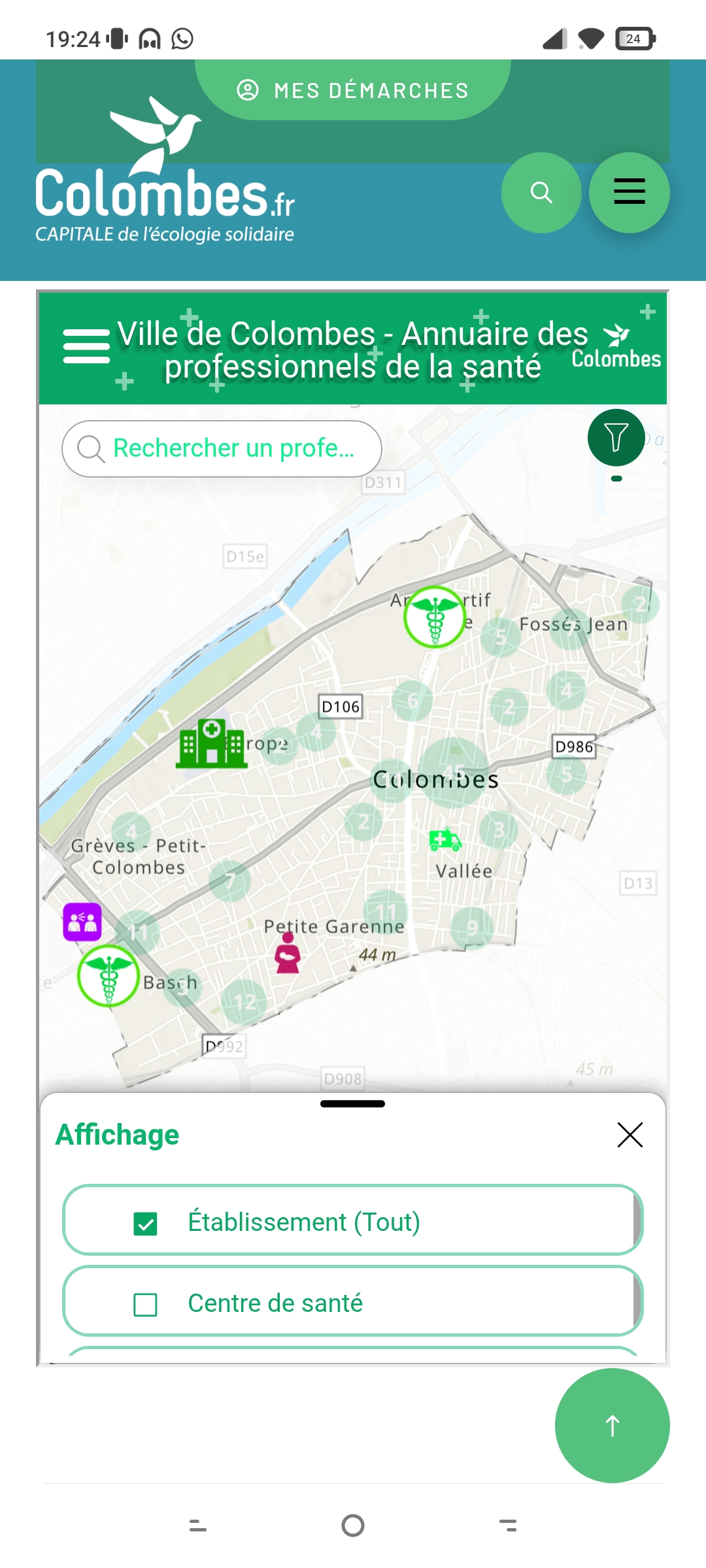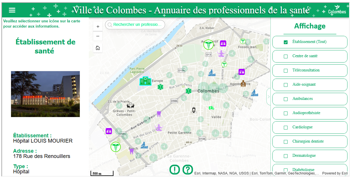 L’application permet de visualiser l’ensemble des établissements et professionnels de santé directement sur une carte de Colombes, offrant une lecture claire et immédiate de l’offre de soins disponible. En cliquant sur un point, l’utilisateur accède à toutes les informations utiles : nom, adresse, numéro de téléphone ou spécialité. L’outil intègre également un système de choix pour n’afficher que les spécialités qui nous intéressent, ainsi qu’une recherche par nom pour retrouver rapidement un praticien ou un établissement précis. L’ensemble rend la consultation des services de santé plus simple.