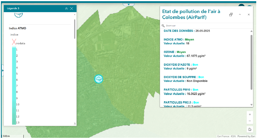 Toutes les données du service, en divers formats (tableur, texte, image, etc), ont été rassemblées et traitées pour être exploitables par le SIG. Elles ont ensuite été publiées sur le serveur SIG pour assurer leur accéssibilité. L'Experience a été organisée en divers pages intégrant plusieurs WebMap avec des fonctions différentes. Pour les conçentrations quotidiennes des polluants dans l'air, un Notebook a été programmé pour exécuter un script ArcPy tous les 00h10. Ce script récupère automatiquement les informations sur l'API de AirParIf et met à jour les données dans notre serveur. Des outils de cartographie rapide, de mesure spatiale et d'édition ont été ajoutés. Cet ensemble a fait de l'application un outil tout en un sur lequel le service s'appuie désormais dans ses activités quotidiennes.